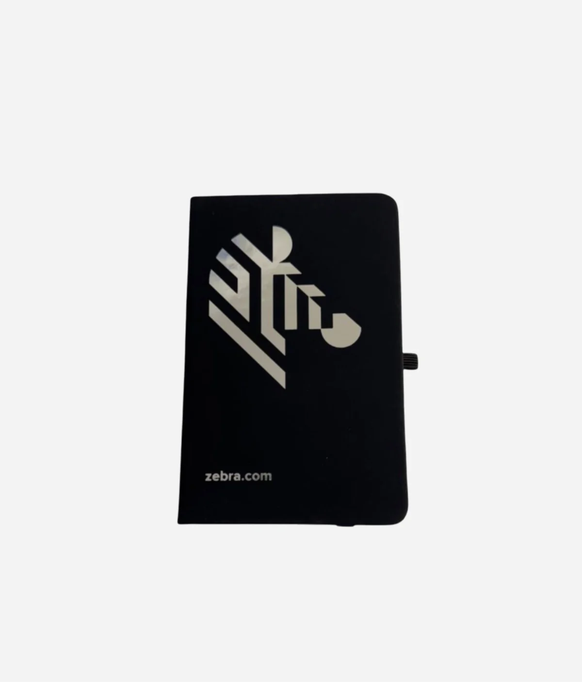 Black A6 Softcover Notebook with 80 lined sheets, elastic closure back pocket and bookmark and pen loop. Silver Blocked with Zebra Head and url.